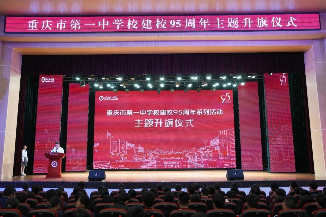 4月20日清晨,在重庆市第一中学校建校95周年华诞即将到来之际,学校在艺术楼大礼堂举行庄严而隆重的主题升旗仪式。全体师生齐聚一堂,回望九十五年奋斗历程,展望建校百年辉煌目标。邓小平故居陈列馆馆长刘慧、文管部工作人员高勇,校友代表、清华大学博士研究生陶云松,以及重庆一中校长毛明山,党委副书记袁敏,党委委员、副校长卫晋丽,党委委员、纪委书记周鹊虹,党委委员庄仕军,党委委员、副校长何文吉,党委委员、副校长郭仕文,党委委员李杰,副校长唐吉耀出席活动。