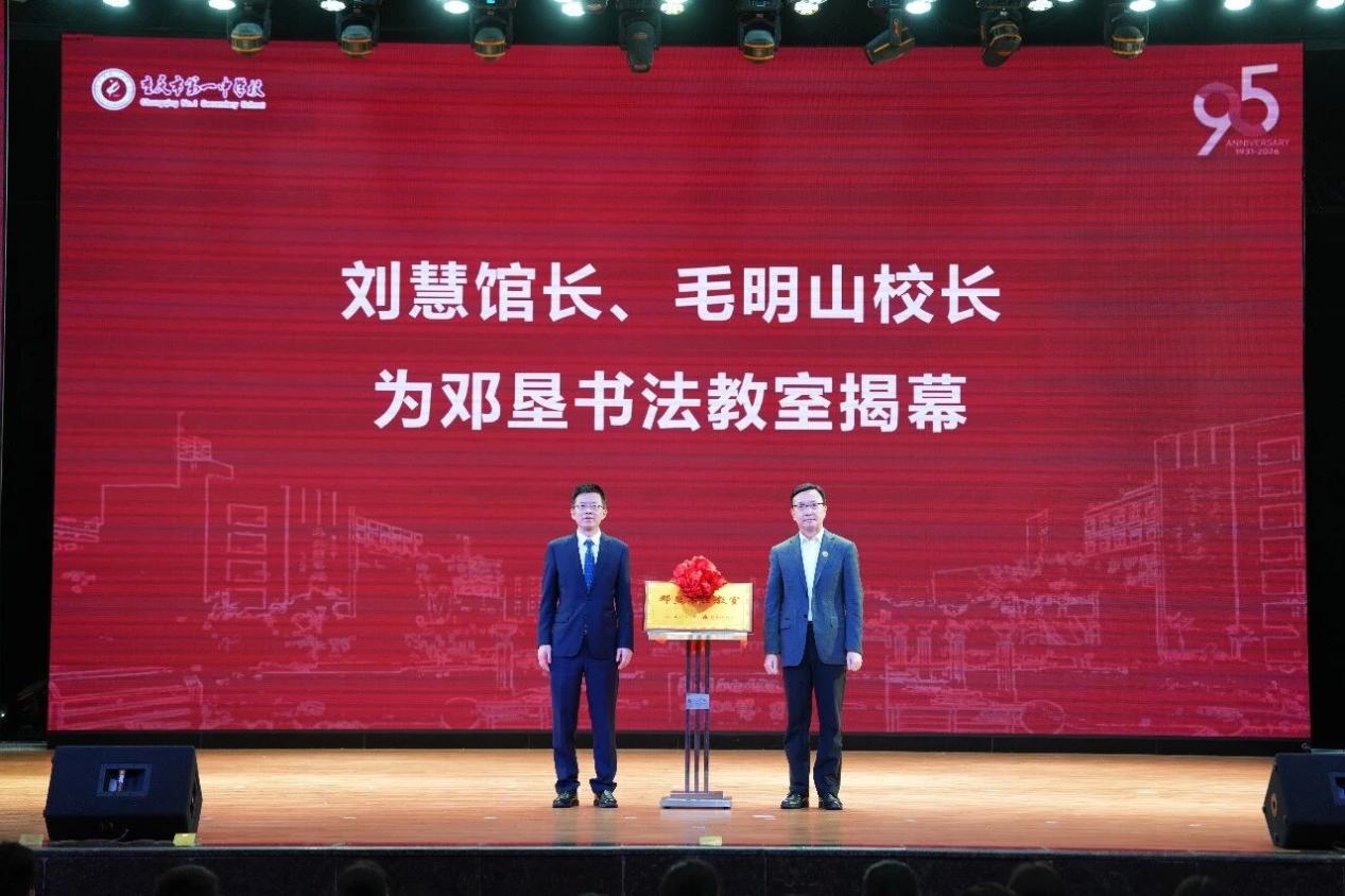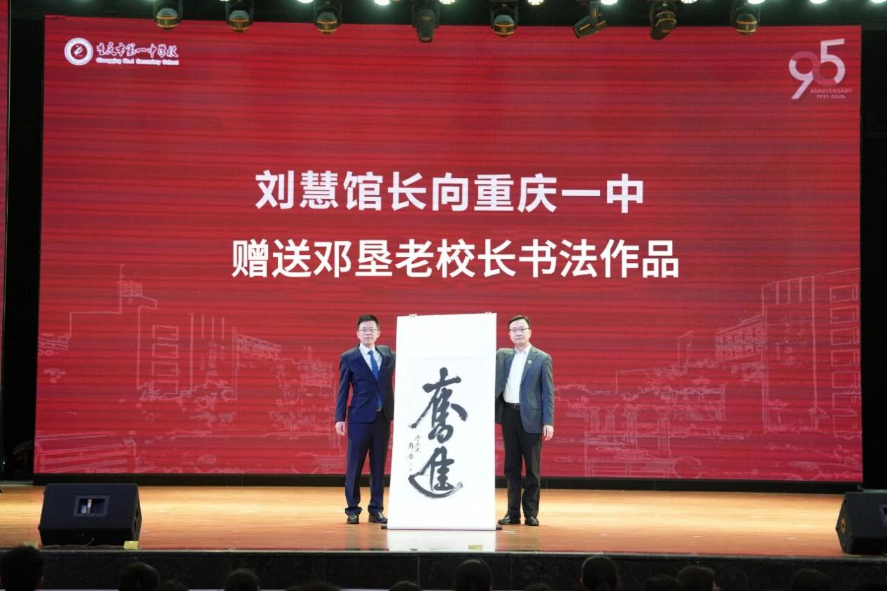 仪式上,邓小平故居陈列馆馆长刘慧与重庆一中校长毛明山共同为“邓垦书法教室”揭幕。刘慧馆长代表陈列馆向学校赠送了一份意义非凡的礼物——邓垦老校长在95岁高龄时亲笔创作的书法作品,内容为苍劲有力的“奋进”二字。这份跨越时空的嘱托,由毛明山校长郑重接受。邓垦老校长曾于1952年担任重庆市教育局党委书记、局长等职务,并兼任重庆一中校长,对重庆一中倾注了大量心血,为学校教育事业的发展作出了重要贡献。“邓垦书法教室”的设立,旨在深入挖掘和传承老校长的教育思想与智慧,让先贤精神在新时代绽放更大光彩。