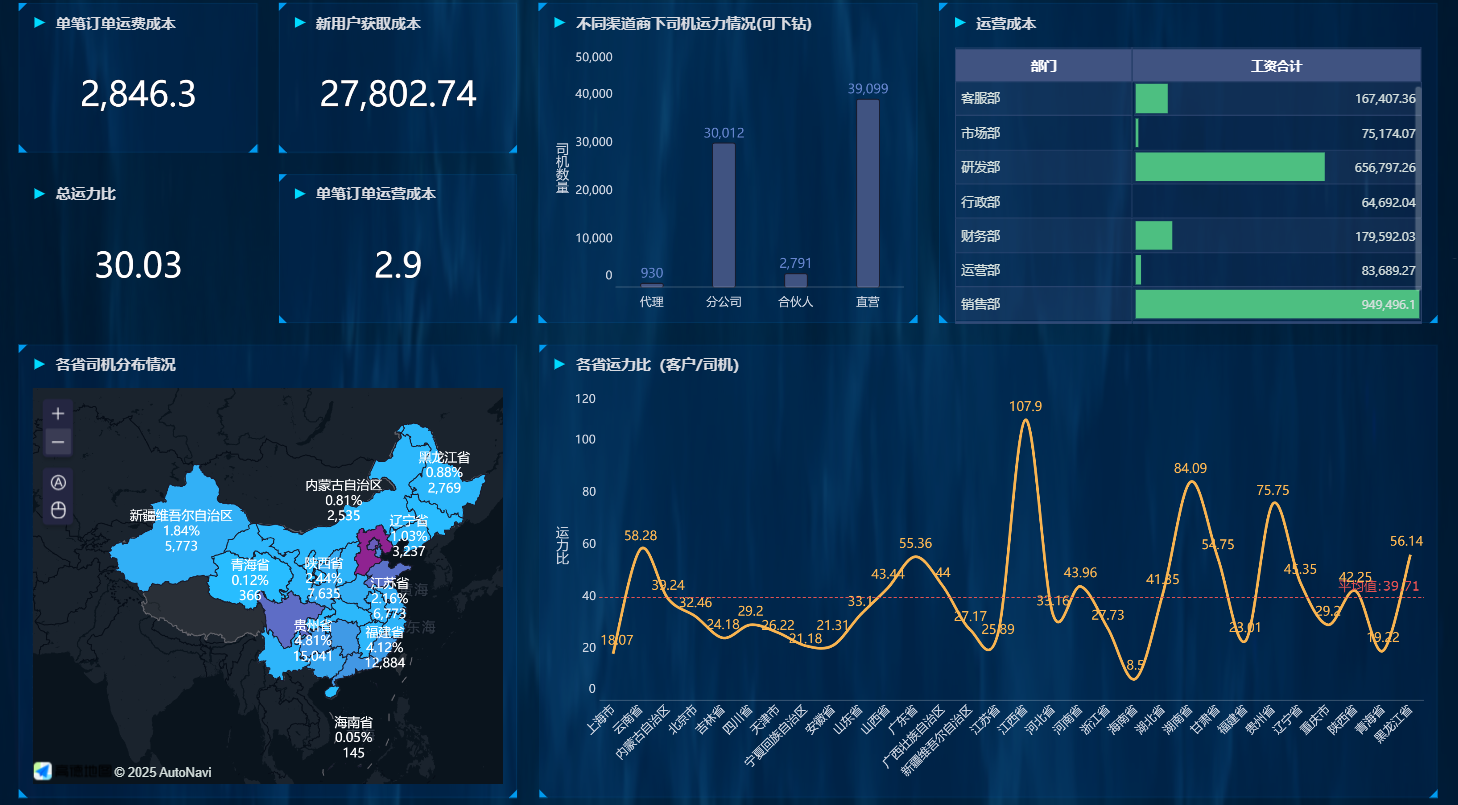 成本管控也变具体了。看板把运力采购、市场获客这些大项成本拆解到了可管理的粒度。比如,数据直接显示运力采购成本占总成本的30.03%,而新客户获取成本平均高达27,802.74元一户。当运营团队看到这个数字,他们自然会去思考:如何优化线路搭配降低空载率?哪个获客渠道的投入产出比更高?