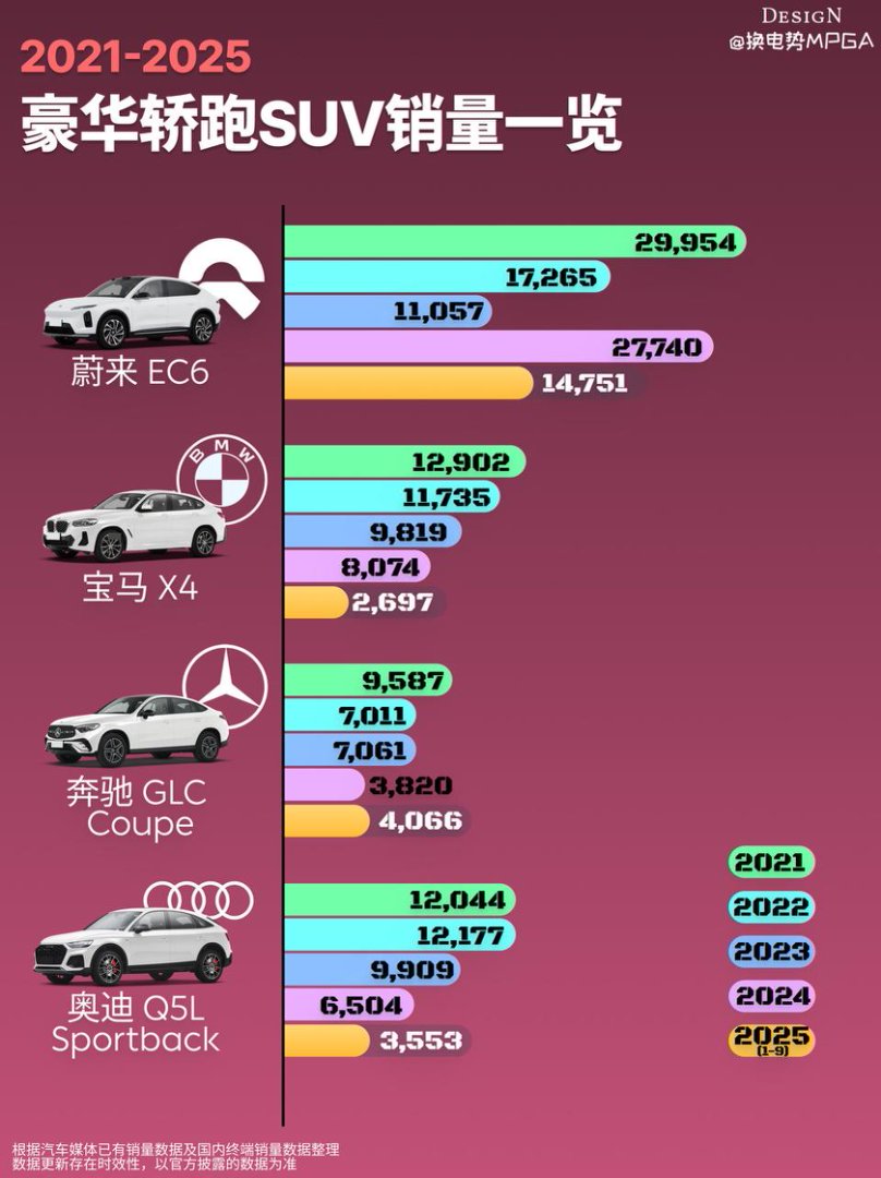 除了以上这些,近年来我国在航空航天、人工智能、高铁基建、船舶制造、新能源汽车等领域也都有了关键性突破,就拿新能源汽车来说,如今国产高端电车完全具备了和奔驰、宝马、奥迪这些传统豪华品牌分庭抗礼的实力,比如蔚来EC6,这台车的销量已经连续两年超过了BBA同级车型的总和,在豪华轿跑SUV市场上一骑绝尘。