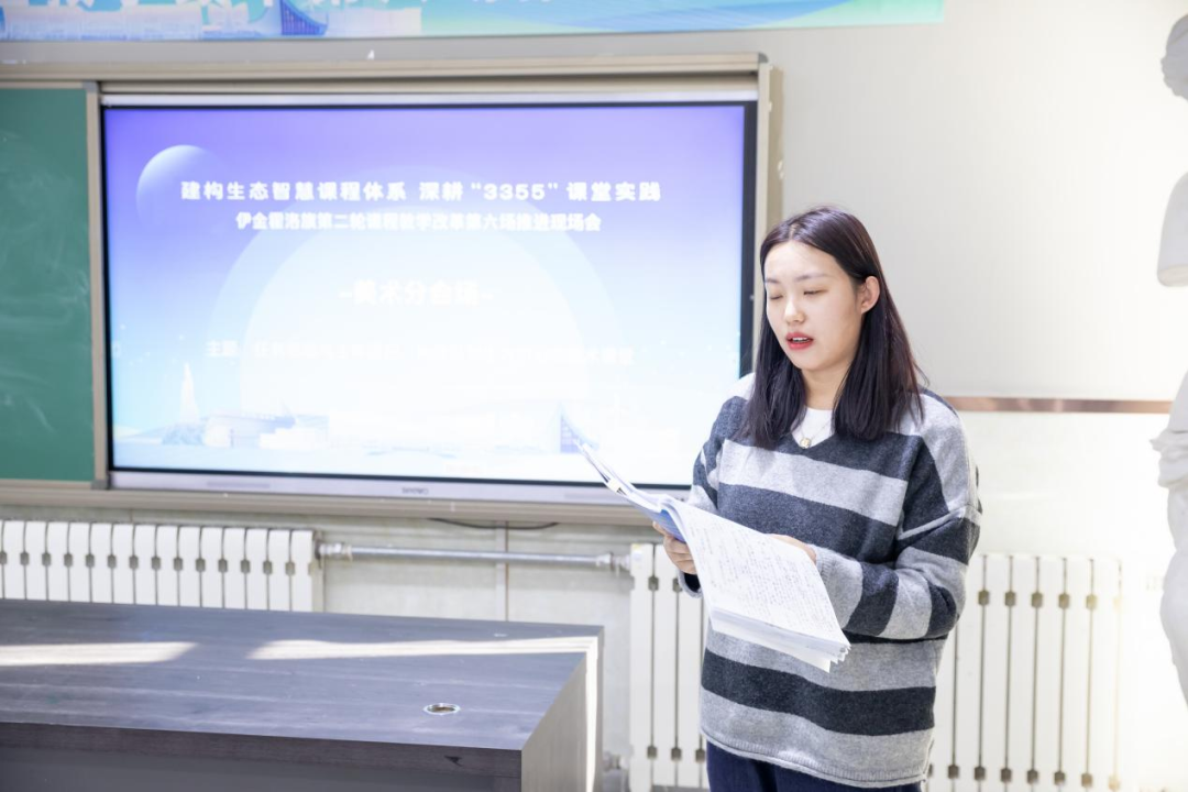 美术备课组长王钰超老师随后作了题为《美育新程,探索绽放——美术学科》的学科课程建设与实施专题汇报。她系统、深入地阐述了学校“尚美艺术”课程体系的顶层设计与实施路径,重点介绍了学校“3355生态课堂”模式在美术学科的创造性落地情况。汇报以 “任务驱动与主体回归——构建以学生为中心的美术课堂” 为核心脉络,详细解读了如何通过设计序列化、情境化的学习任务,搭建自主学习支架,营造合作探究氛围,从而在制度与操作层面保障学生在美术学习中的中心地位,为课堂教学转型提供了坚实的课程系统支撑。