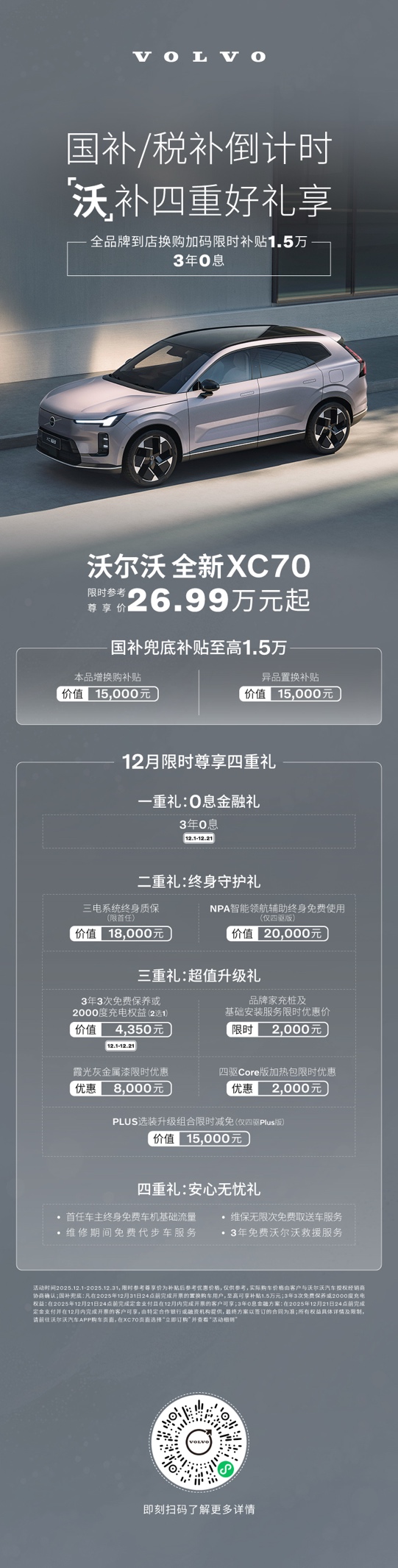 在金融方案上,12月21日前订购全新XC70,将提供3年0息的限时金融政策,至高可为消费者节省18,000元的利息支出,极大缓解了购车资金压力。为了让车主长久安心,沃尔沃汽车更奉上价值高达38,000元的终身守护权益,包含三电系统终身质保(限首任车主)与NPA智能领航辅助系统终身免费使用(仅四驱版),将前沿科技与无忧保障进行到底。