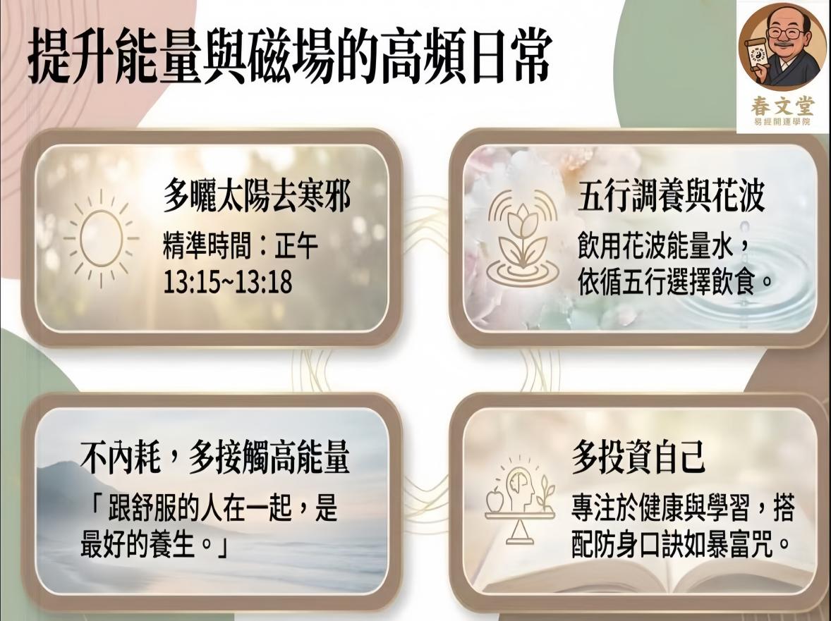林春文院长指出,易经的“气”与现代量子物理、环境心理学的 “能量场” 本质相通——万物皆有能量频率,人是能量的载体,心念、情绪、行为、环境共同构成个人磁场,磁场决定运势走向。所谓 “旺自己”,核心就是主动提升自身能量频率,让内在磁场与天地正气、正向人事物同频共振,从而吸引好运、规避负能,实现身心安泰、诸事顺遂。