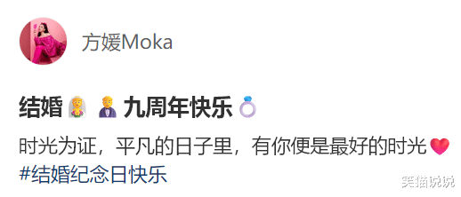 方媛在自己的个人社交账号上晒出了她和丈夫郭富城的甜蜜合照,庆贺她和郭富城结婚9周年纪念日。方媛配文道:“结婚九周年快乐。时光为证,平凡的日子里,有你便是最好的时光。”