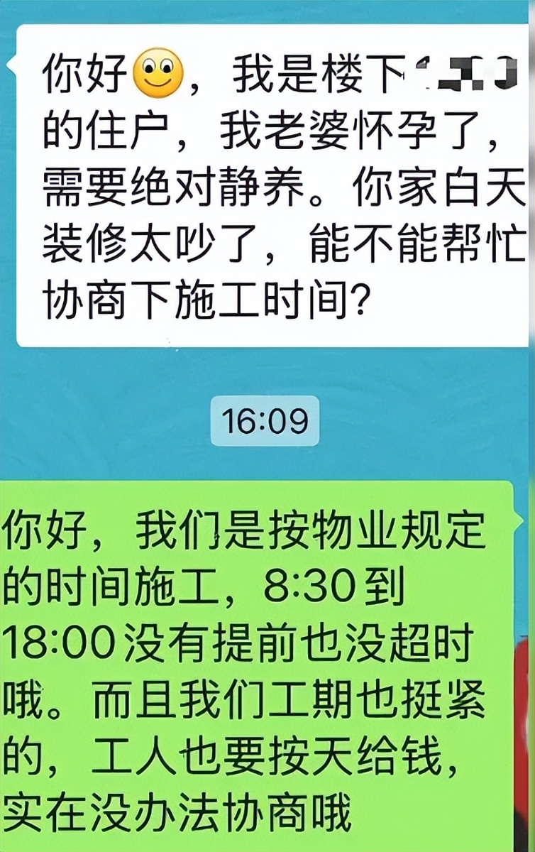 原因很简单,邻居说自己的妻子已经怀孕了,她每天需要好好休息,你家天天装修不得装三四个月,这太影响到孕妇休息了。