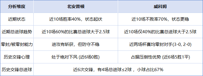 2. 威科姆的心理与战术优势:历史交锋威科姆5胜1平保持不败,心理优势巨大。在杯赛中,他们近期也展现了稳固的防守(连续零封)。面对手下败将,他们可能以控制节奏和高效反击为主,不一定会主动寻求大比分。