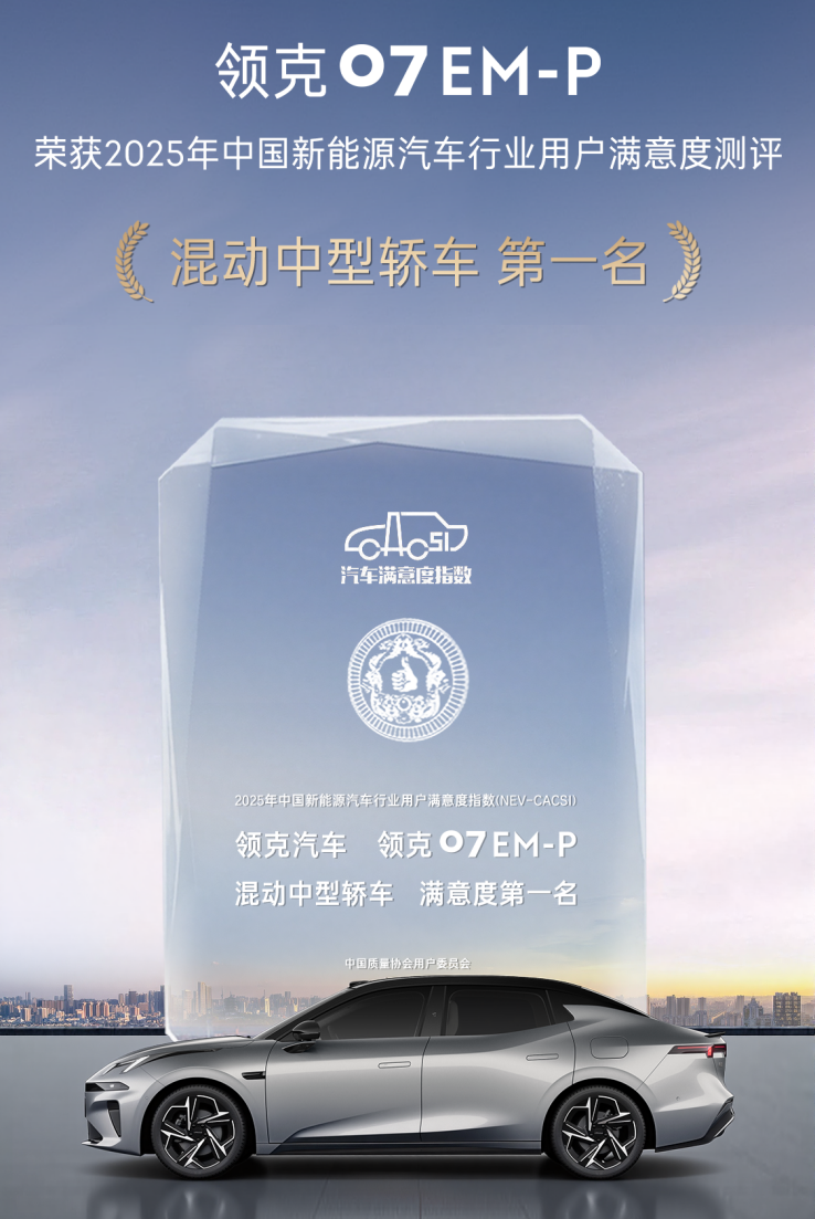 现在越来越多的消费者开始意识到,与其完全听信厂商的单方面宣传,不如静下心来研究一下真实车主的长期使用反馈。口碑,正在成为衡量产品价值的一把重要尺子。最近,由中国质量协会发布的2025年中国新能源汽车行业用户满意度指数(NEV-CACSI)测评结果,就为市场提供了一份极具分量的口碑参考。在这份权威榜单中,领克 07 EM-P荣获“混动中型轿车”类别用户满意度第一名,这意味着它在众多真实车主心中,建立起了坚实的认可度。