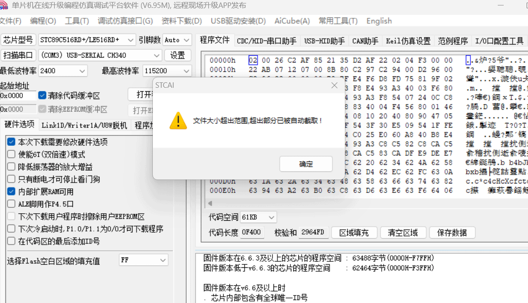 STC 下载代码时提示 “文件超出范围”,核心原因是 编译后的代码文件(.hex/.bin)大小,超过了目标 STC 单片机的可用 Flash 容量,或因配置、编译设置错误导致工具误判容量。