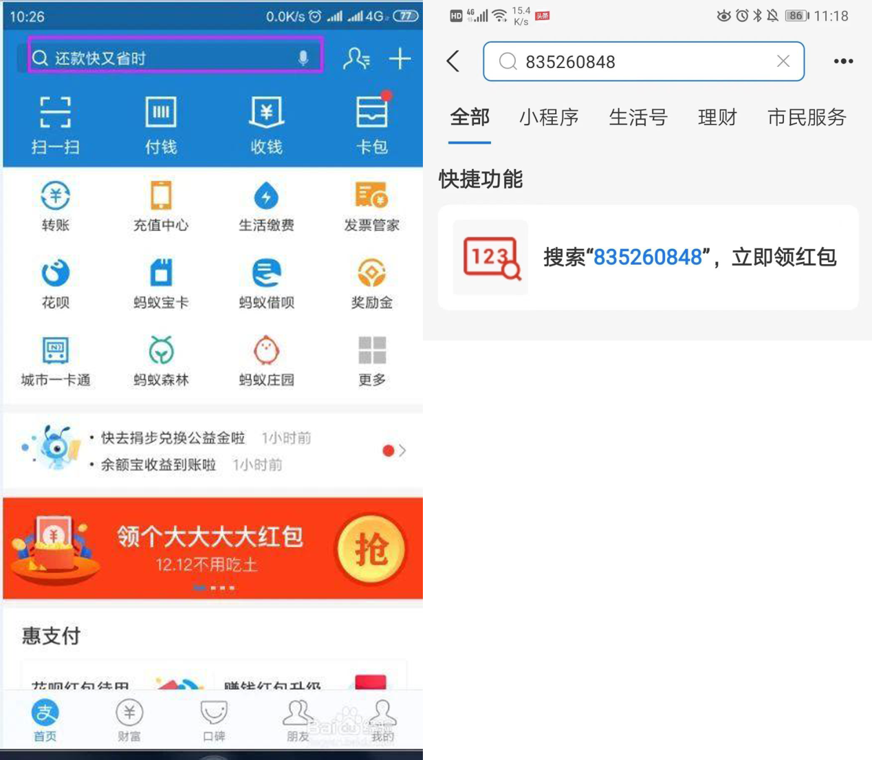 直接复制数字:835260848前往支付宝App顶部粘贴搜索就可以领红包,以后每次点搜索栏下面就有搜索记录了,不用每天输入数字和扫码了!之后还能领隐藏红包!