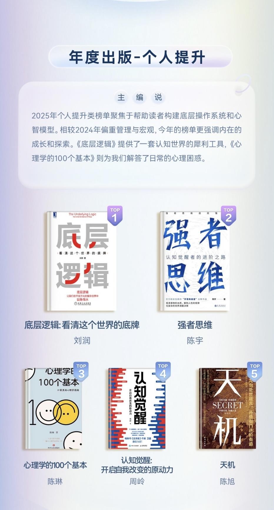 其中的“年度出版-个人提升”榜单,就适合我这种想提升自己、又怕读到“水书”的人。我现在就在看榜单里的《心理学的100个基本》。