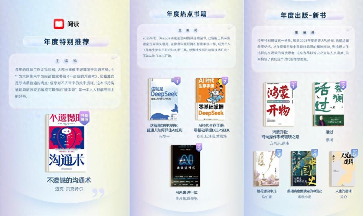 今天#鸿蒙2025年度先锋榜揭晓# ,华为阅读发布了2025年度榜单。说实话,现在的书太多了,筛选成本很高。而这份榜单,就是为大家总结时下最值得一读的好书。它从年度特别推荐、年度热点书籍、年度出版新书等多个子榜单甄选精品好书,主打一个覆盖全,满足不同需求。