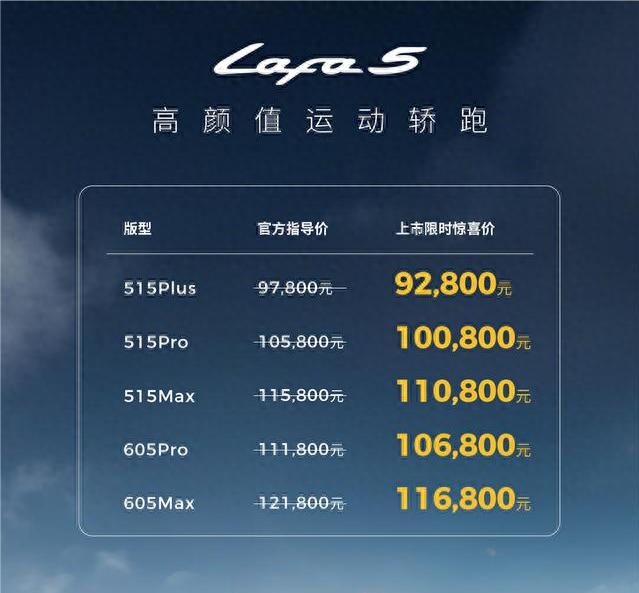 零跑Lafa5共推出5款配置车型,主要区别在于续航、动力和智能配置。为帮助消费者清晰了解各版本差异,特整理以下对比表格: