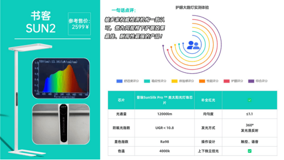 如果你预算相对较低,追求护眼,那么书客SUN2可以闭眼入,采用普瑞定制SunSilk Pro™类太阳全光谱灯珠,并搭载RRT2.0红光养眼技术,精准削弱有害蓝光的同时补全红绿光波段,有效促进眼轴发育的健康,减缓92%近视发展速度。