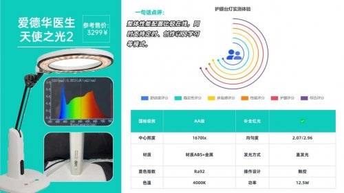 爱德华医生在市场上的知名度也比较高,不过主打的是高端路线,这款爱德华医生天使之光2也是一款价格比价高的台灯,不过在核心的光源上做的比较到位,内置全光谱灯珠,并且搭载NIR技术来补充680-700nm的有益红光波段,让光线看起来相对柔和,同时可以缓解视觉疲劳,不过采用的是蓝光激发全光谱技术,也没有额外对光谱中蓝光部分进行优化,在蓝光控制比较逊色,实测蓝光峰值高达1.0,跟同样有红光的书客对比来看,这款在护眼效果以及性价比上都不占优势。