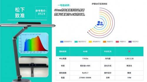 松下是综合性的电器品牌,涉及家电、照明、智能家居等多个领域,并且凭借稳定的品质, 在照明市场打响知名度,而这款护眼台灯是旗下比较受欢迎的一款护眼台灯,光源层面上,松下采用全光谱灯珠,不过蓝光激发全光谱设计,虽然呈现出来的光线明亮且柔和舒适,但是要注意的是,这款护眼灯的蓝光比较高在1.0左右,可能在一定程度上影响着光线还原度以及护眼效果。