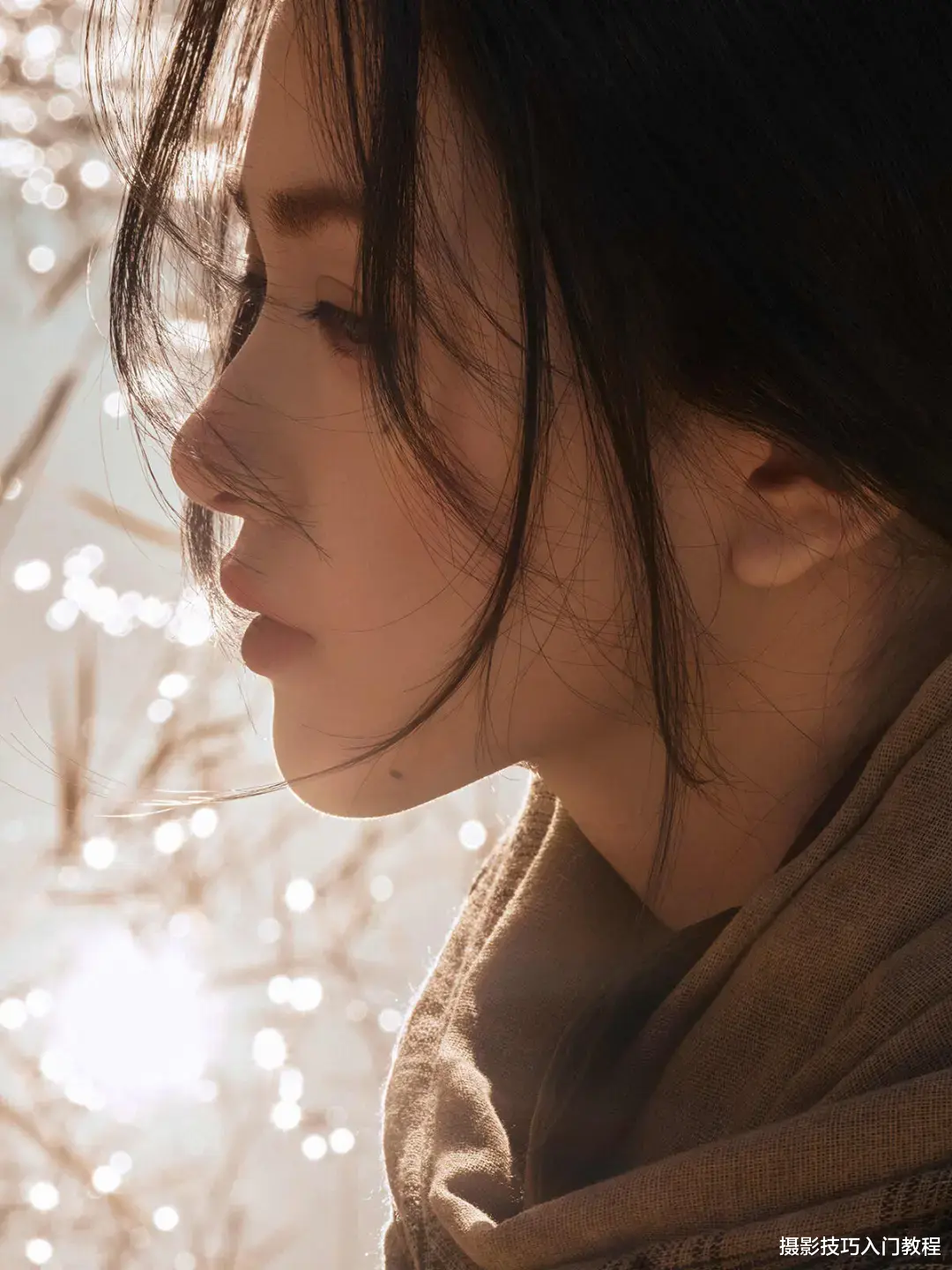 逆光拍摄,模特侧脸入镜,面部轮廓优越,或者是正面直视镜头都可以,背景的光斑点点也为照片增色不少。