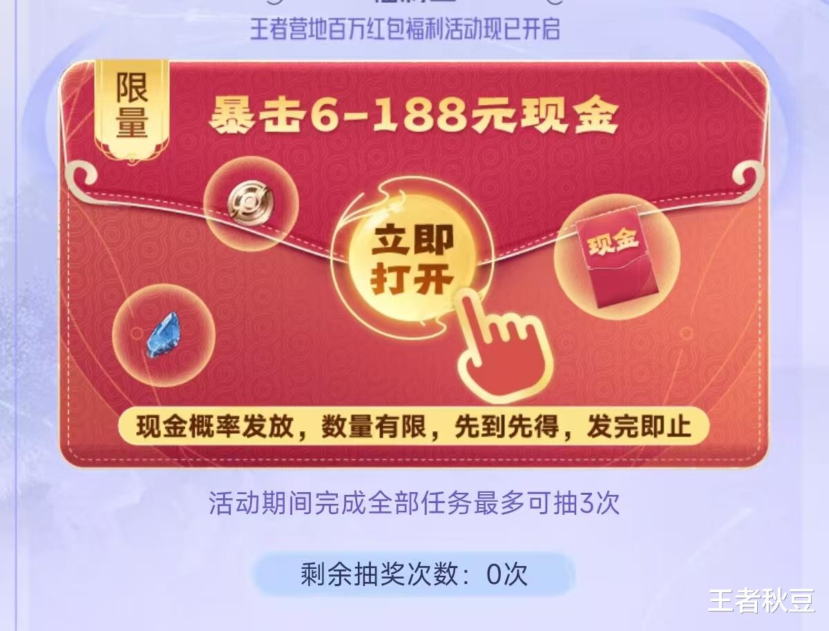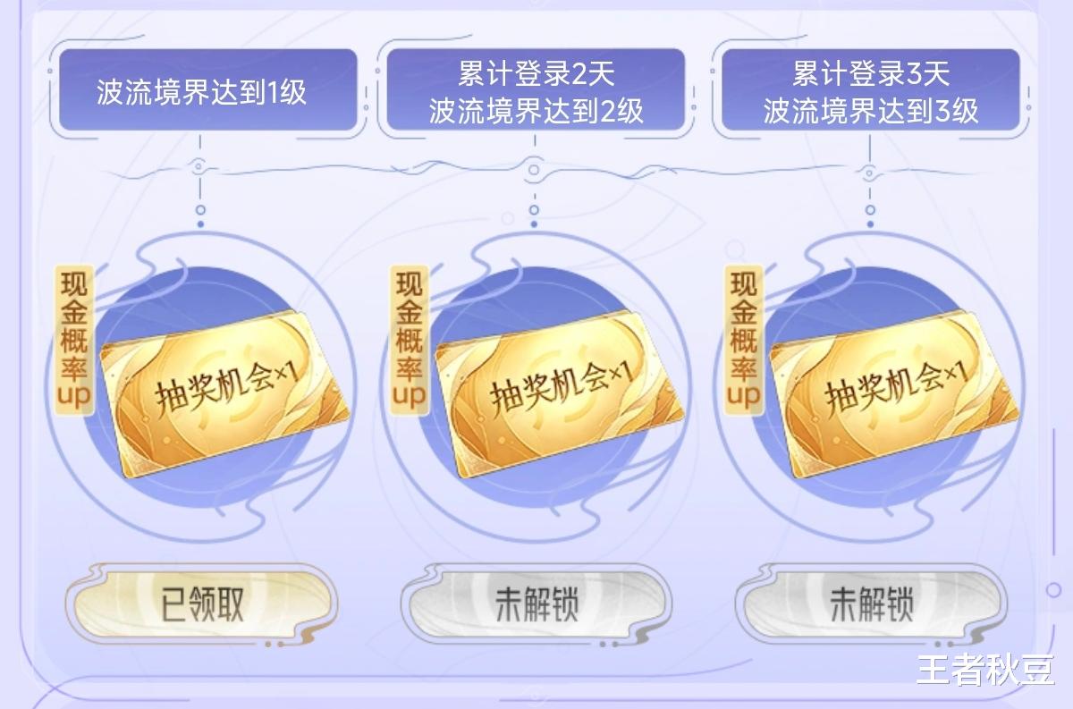 在营地每日福利中,活动期间完成全部任务可以获得三次抽奖机会,波流境界达到1级送一次抽奖机会,累计登录2天并波流境界达到2级送第二次机会,累计登录3天波流境界达到3级送第三次机会。经测试,抽到红包的概率挺高的。