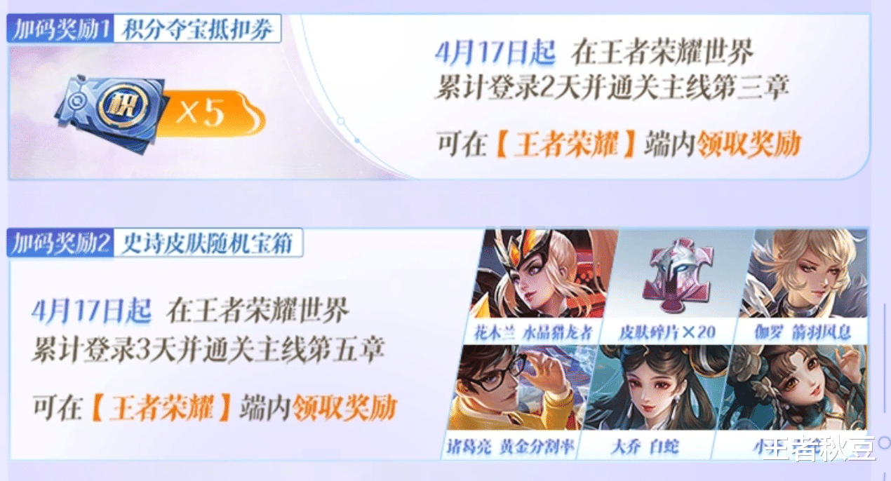 4月17日起,只要在王者荣耀世界累计登录2天并且通过主线第三章,就能领取5张积分夺宝券,可以用于王者荣耀抽取荣耀水晶,兑换荣耀典藏皮肤。累计登录3天且通关主线第五章,就能在王者荣耀领取5款史诗皮肤五选一,其中大乔的白蛇和小乔的青蛇都是不错的皮肤。如果皮肤都有,都能兑换20个皮肤碎片。