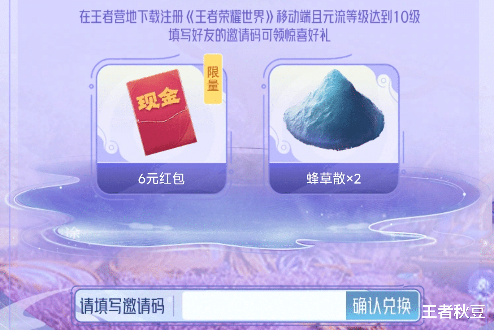 在王者营地下载注册《王者荣耀世界》移动端且元流等级达到10级,就能填写好友的邀请码领取惊喜好礼,有限量获得6元现金红包,还有2个蜂草散,蜂草散是回血道具,可以回复1000点血量。由于基本上都会升到10级,记得叫好友写上你的邀请码,你也能写上好友的邀请码。