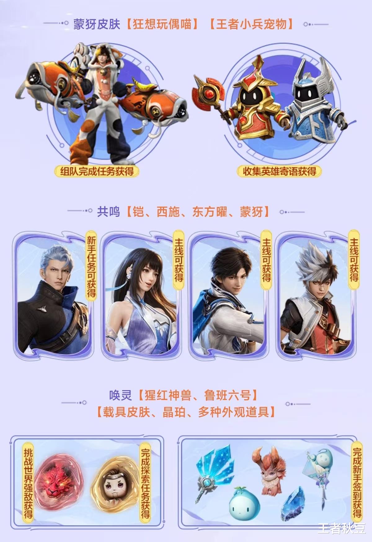 注册角色后进入游戏,组队完成任务可以获得蒙犽皮肤【狂想玩偶喵】,收集英雄寄语可以获得王者小兵筹物,通过任务还能获得铠,西施,东方曜和蒙犽的英雄共鸣。当然也少不了唤灵猩红神兽和鲁班六号,也就是宠物,能帮忙打伤害或者辅助。