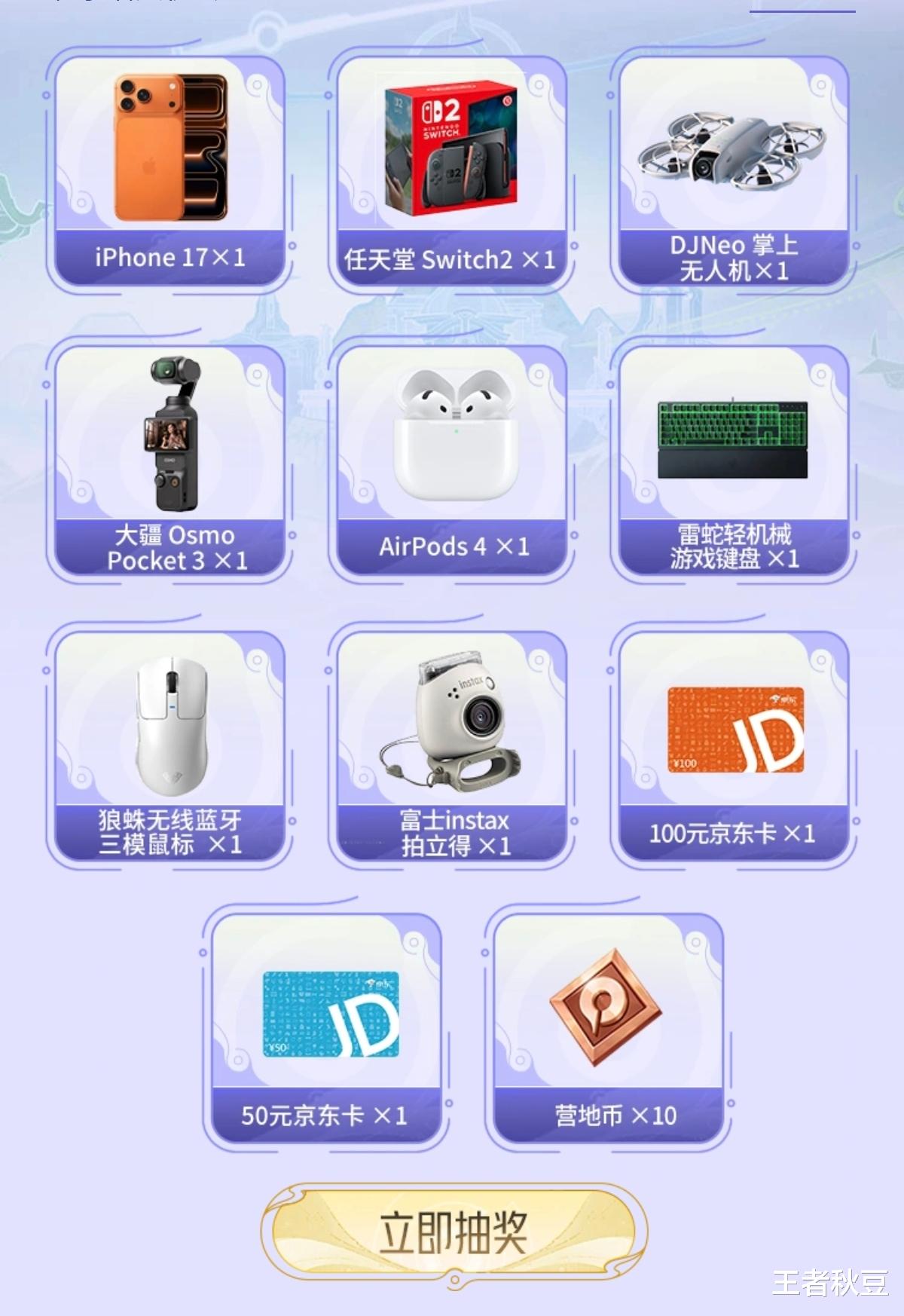 在营地每日福利中的活动里,有5次抽奖机会,营地下载世界+2次机会,访问营地专区+1次机会,关注官方号+1次机会,关注服务号+1次机会。抽奖机会有概率抽到苹果17,任天堂Switch,无人机等等福利,可以试一试运气。