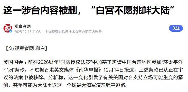 在2026财年《国防授权法案》的最终磋商文本中,原本明确写着“邀请中国台湾参加环太平洋军演”的条款,被整体删除,连“观察员”这样的模糊身份都没有留下。