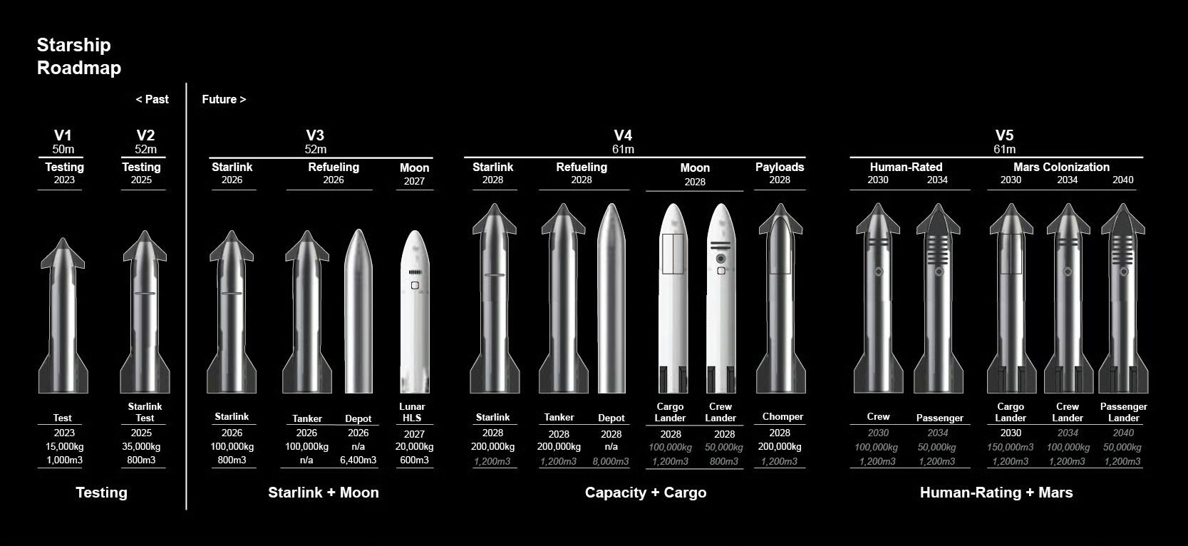 航天圈重磅揭秘!SpaceX星舰敲定长达17年的完整发展路线,2023-2025年迭代V1、V2版本,2026-2027年推进V3版本,2028-2029年升级V4版本,2030-2040年迈向V5终极形态,覆盖技术验证、任务落地到星际殖民,每一代迭代都承载着马斯克的火星殖民梦,也重塑着全球航天的发展格局。