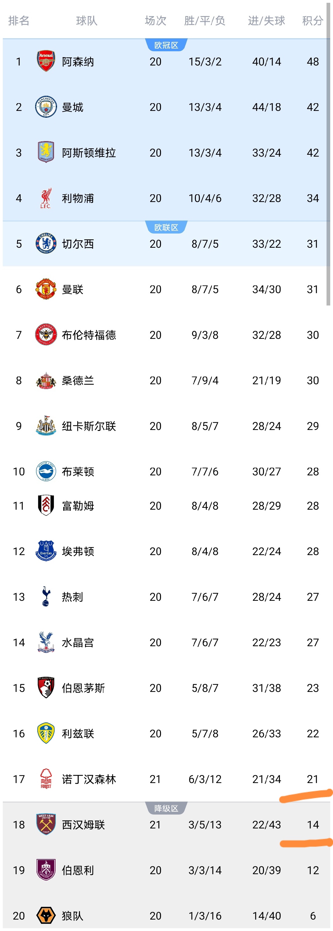 可以看到在诺丁汉森林队逆转西汉姆联之后积分达到了21分,暂时领先了降级区的西汉姆联队7分,这个领先优势还是很大的,诺丁汉森林这保级大战的3分尤为珍贵啊。这是一场价值6分的胜利。可以说英超不仅争冠精彩,保级战也精彩,争四也精彩。世界第一联赛名不虚传!