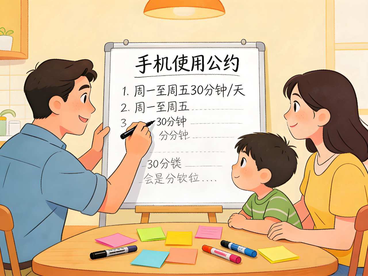 结合孩子的意见明确条款,比如:“周一至周五,完成所有作业并核对无误后,可玩25分钟;晚上8点半前必须将手机交给家长保管;周末每天累计1小时,分上下午各30分钟;若超时,次日取消全部使用资格。”把公约打印出来,全家签字后贴在客厅显眼处。