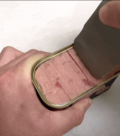 利用它锋利的边缘直接竖着插进午餐肉中,然后就可以按照自己需要的薄厚进行切割。这样一来,往外拿肉也很容易,而且全程都不用刀。