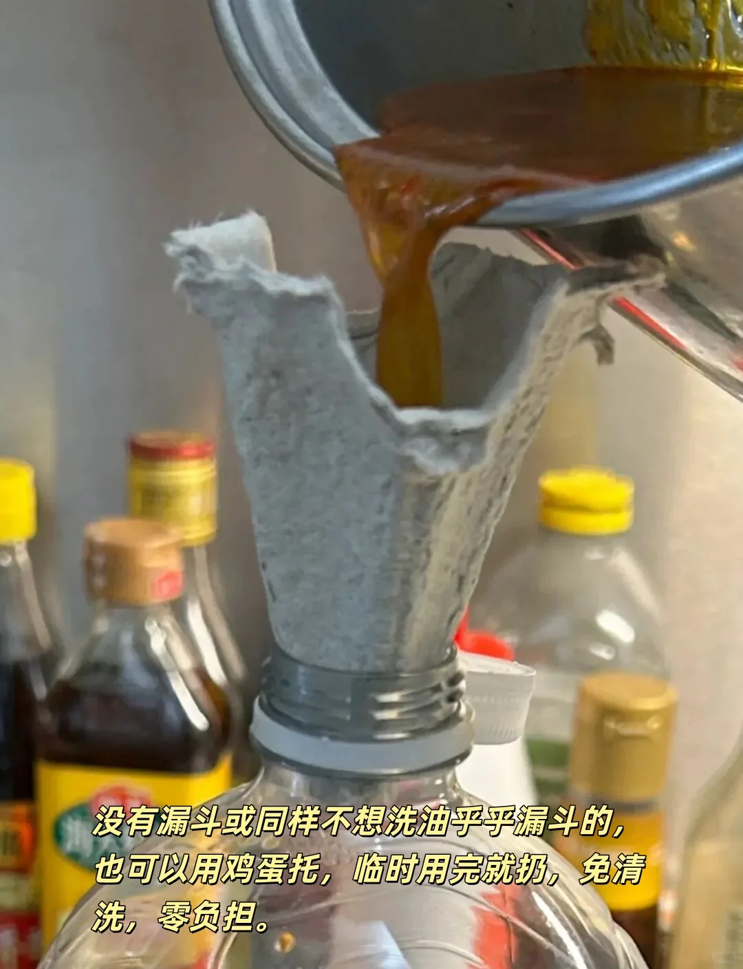 直接用锡纸折出来一个就可以,或者是剪掉一个鸡蛋托,扎个眼儿,也能当个临时漏斗了,用完直接扔,不用清洗,非常方便。