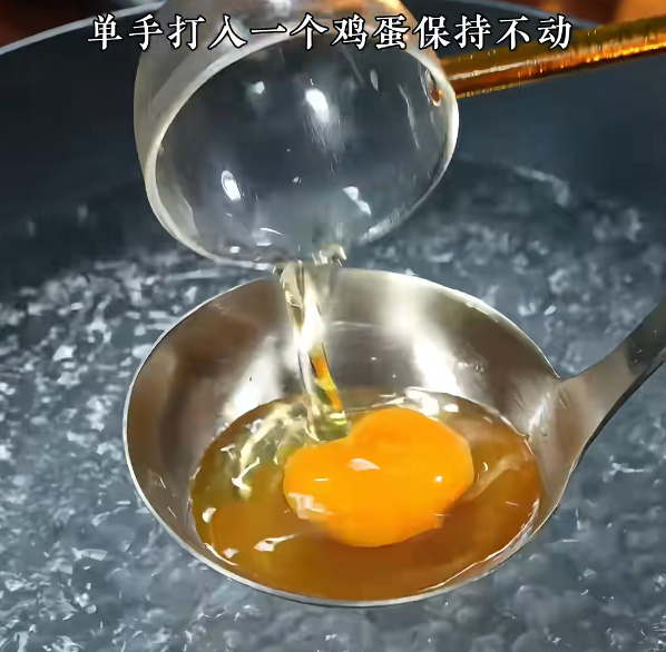 然后我们就可以把鸡蛋轻轻地打进去,然后隔着水把鸡蛋烫成型,整个过程需要三分钟左右。