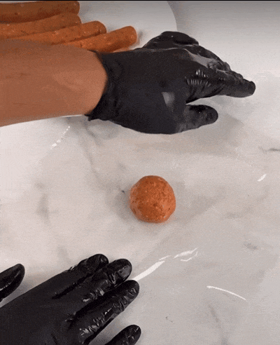 首先在保鲜袋上涂上油,然后把肉馅团成团儿,再放到保鲜袋中间,之后将保鲜袋对折,再用刮板从外往里轻轻挤一挤,肉团就被挤压成一根粗细均匀的香肠了。