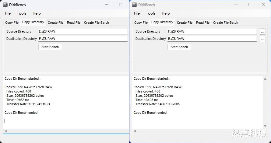 前文都是偏理论方面的性能测试,接下来会进行更贴合实际应用的测试。首先是拷贝照片,我们先从致态TiPro 9000 PCIe 5.0固态硬盘中复制400张照片到PSSD上,照片共计400张、19.2GB,是使用尼康Z8拍摄的RAW格式。在复制到PSSD后,再把PSSD上的400张照片复制回SSD上,测试时使用Diskbench进行拷贝与统计速度。实测将400张RAW照片写入到PSSD的平均速度为1011MB/s,耗时约19.46秒,把PSSD上400张RAW照片复制回TiPro 9000上的平均速度是1466MB/s,耗时13.42秒,也就是说对于RAW格式照片,致态灵·潮流版移动固态硬盘读写速度分别是1466MB/s、1011MB/s。