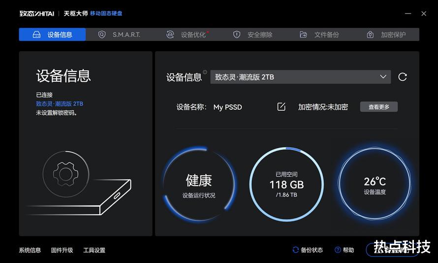 在软件方面,致态灵·潮流版移动固态硬盘目前一共支持致态天枢大师、致态加密软件和致态备份管家APP三款软件,其中致态天枢大师、致态加密软件是PC(Windows系统)上的软件,应用管理、监控、加密PSSD。