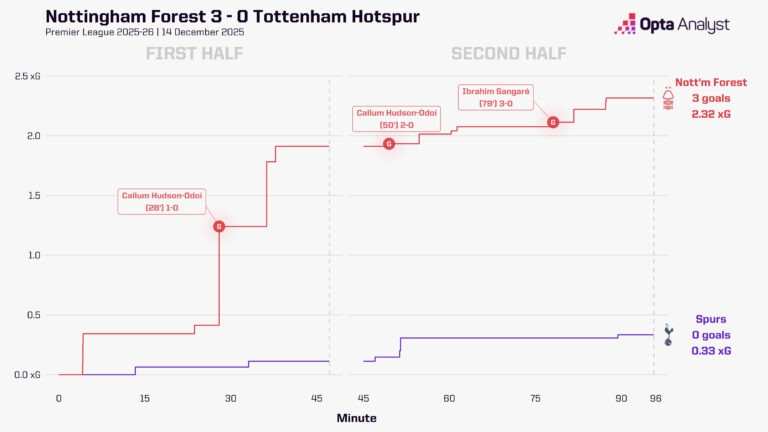 这场比赛,热刺的预期进球值只有 0.33,是森林本赛季面对的最低水平之一;更刺眼的是,这居然只是热刺本赛季英超第四低的单场 xG。