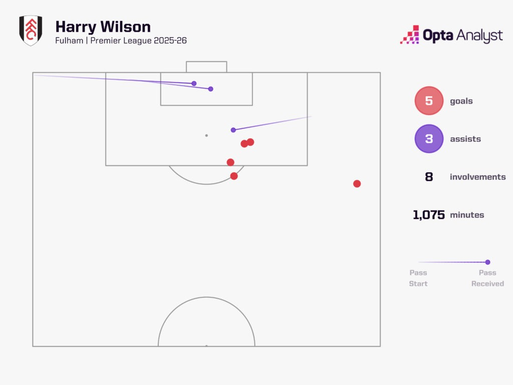 算上本赛季联赛,威尔逊已经在 15 场英超中参与 8 粒进球(5 球 3 助),这个数据已经超过了他上赛季 25 场比赛的总贡献(6 球 1 助)。