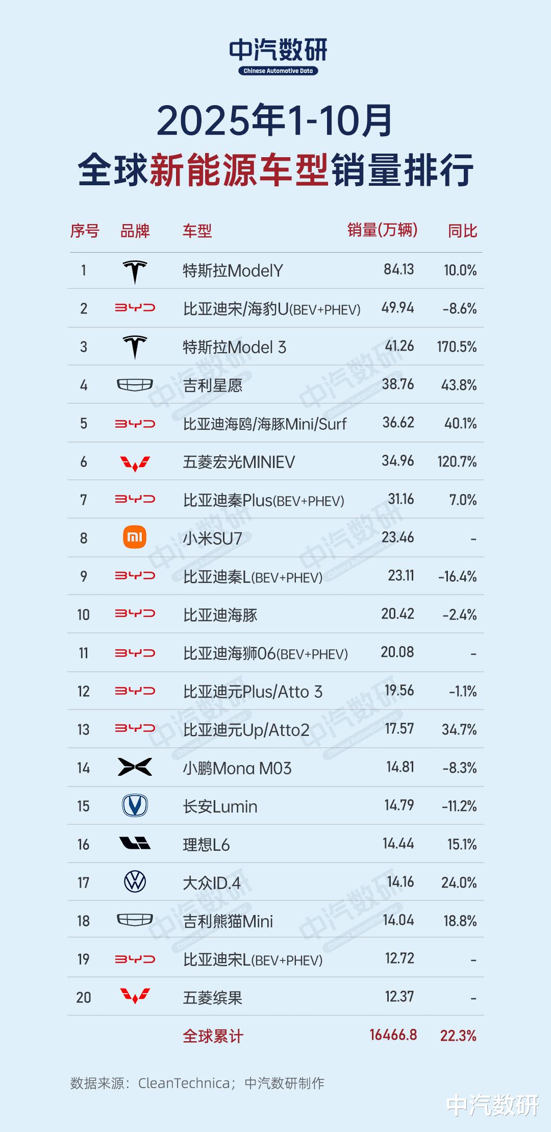 在全球新能源汽车品牌销量TOP20中,中国品牌占据主导地位。比亚迪凭借340万辆的累计销量成绩,稳居全球榜首,同比增长10%。