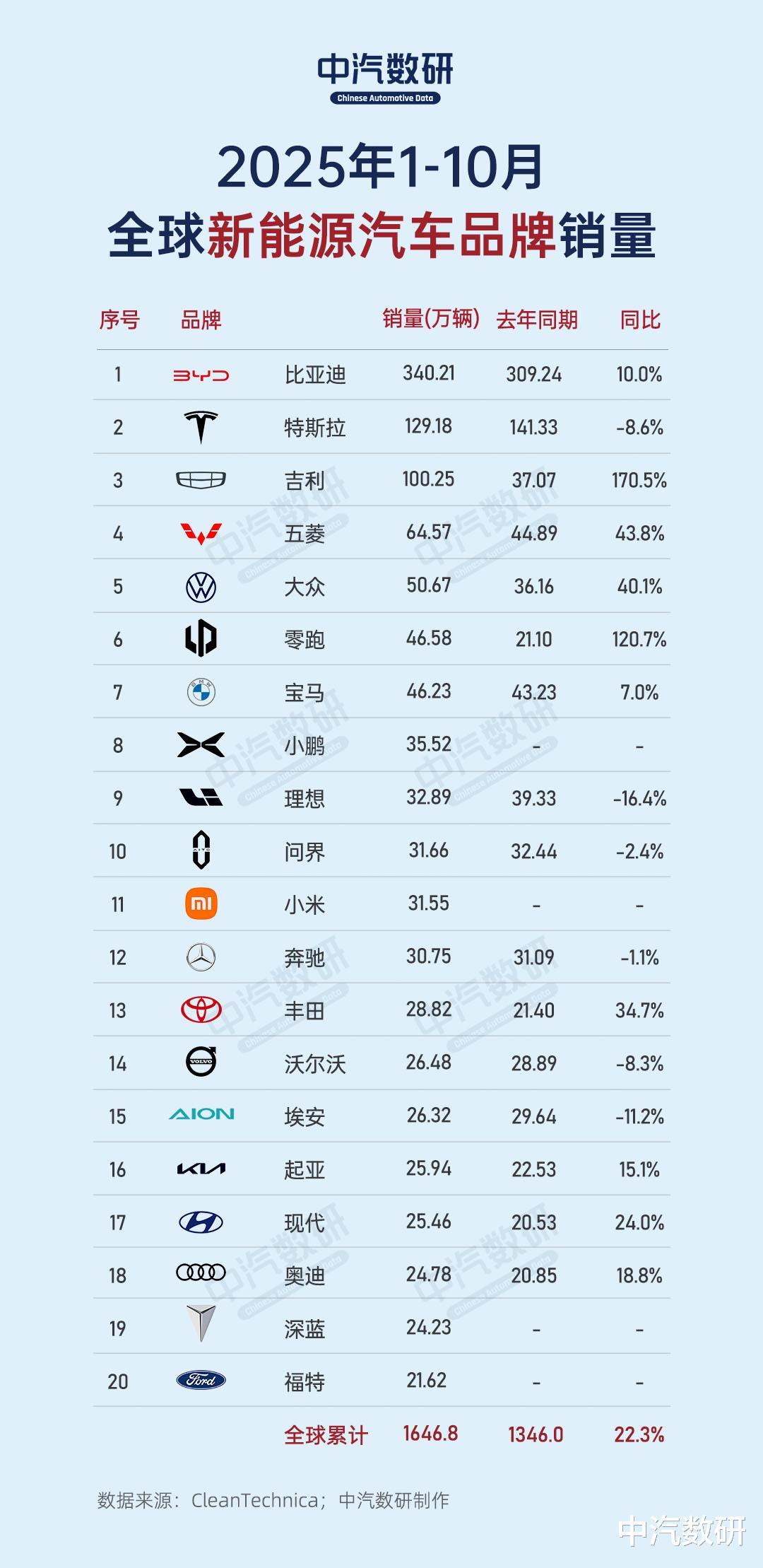 与此同时,传统车企和海外巨头呈现出明显的分化加剧态势。特斯拉作为曾经的全球新能源汽车霸主,1-10月销量为129.2万辆,同比下滑8.6%,跌至榜单第二名。