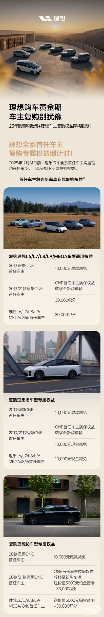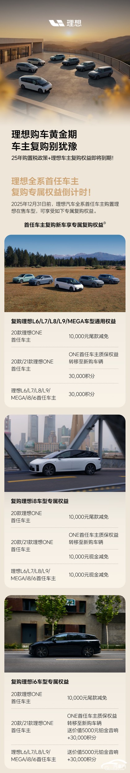 同为造车新势力的理想也在11月底发布购车权益。不同于其他车企,理想汽车的购车福利主要针对首任车主实行复购权益。主要内容为,在今年12月31日前,理想汽车全系首任车主购置理想在售车型,可享受专属复购权益,包括10000元尾款减免、最高30000积分、首任车主质保权益转移至新购车辆等。