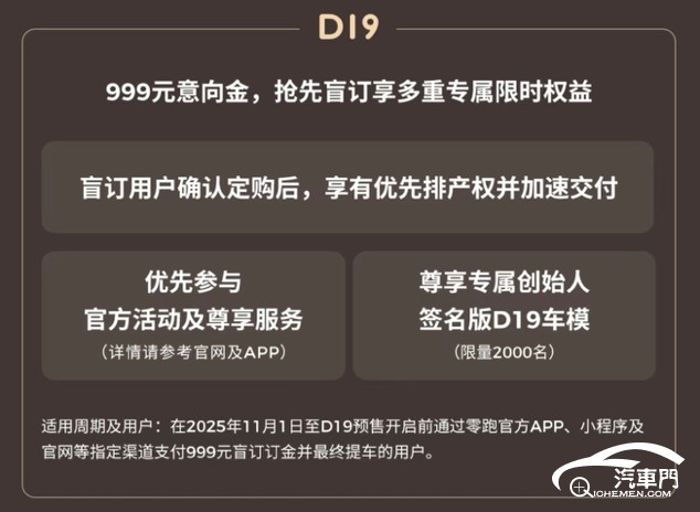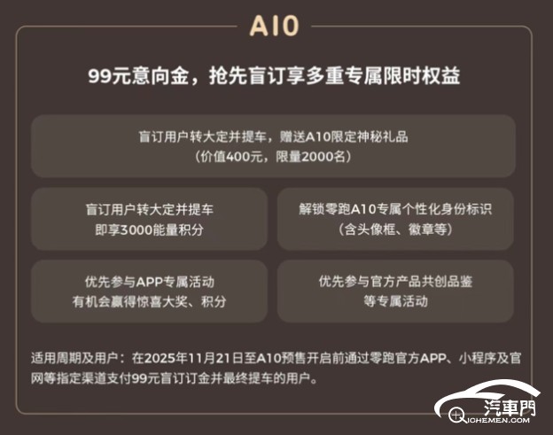 作为今年第一个达成年度销量目标的造车新势力车企,12月,零跑不光对零跑B01、零跑B10、零跑C01等在售款车型提供最高5000元每台的金融补贴、最高17000元每台的十周年感恩礼、2年免费娱乐流量、首任车主整车终身质保售后权益等优惠,还对零跑A10、零跑D19等预售车型开启抢先盲订的多重专属限时权益。权益内容包括优先参与官方活动、个性化身份标识、积分礼品等多重专属限时权益。