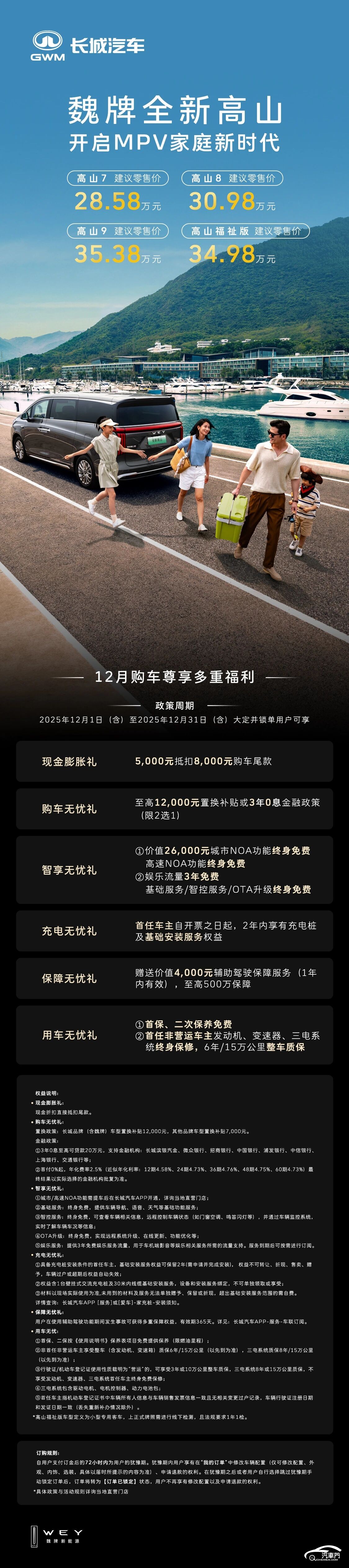 12月1日,魏牌发布12月限时购车权益。购车权益适用车型包括魏牌全新高山、魏牌全新蓝山和魏牌新摩卡Hi4。权益内容包括,在2025年12月1日(含)至2025年12月31日(含)大定并锁单用户可享最高27000元现金补贴、最高15000元兜底新能源置换补贴。此外,魏牌全新高山用户还可享受至高12000元置换补贴或3年0息金融政策。