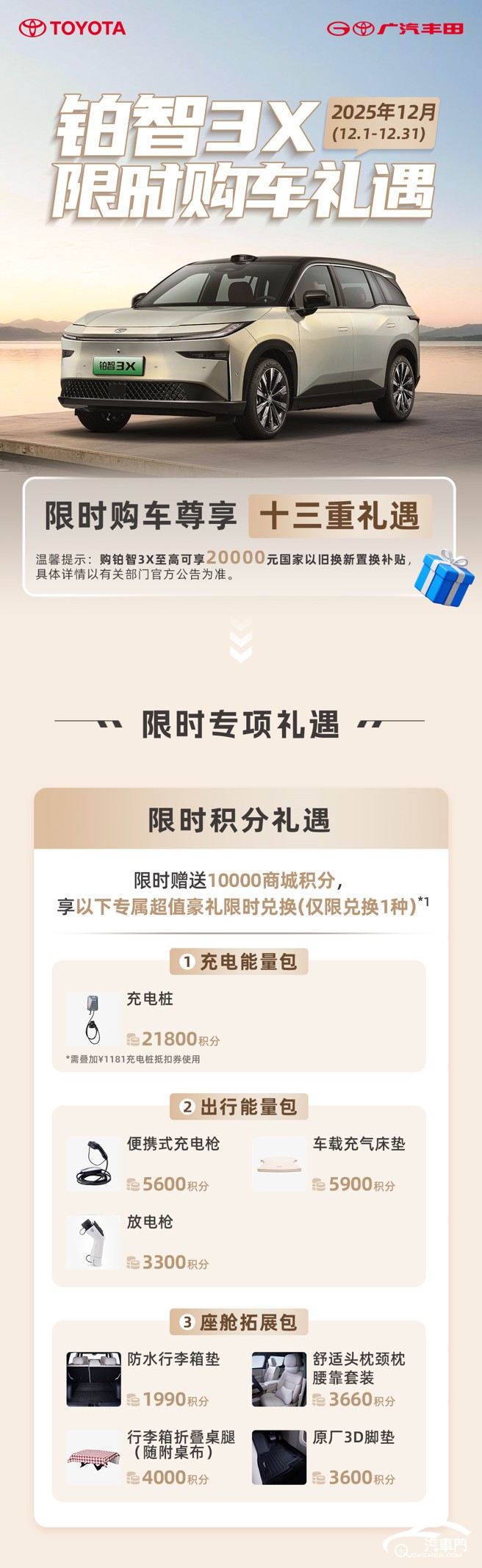 广汽丰田针对爆款车铂智3X实行限时叠加优惠政策。12月1日至12月31日,购买铂智3X至高可享20000元国家以旧换新置换补贴,此外,在12月购买铂智3X至高享受6000元升舱权益、0首付起两年0息金融权益等优惠。