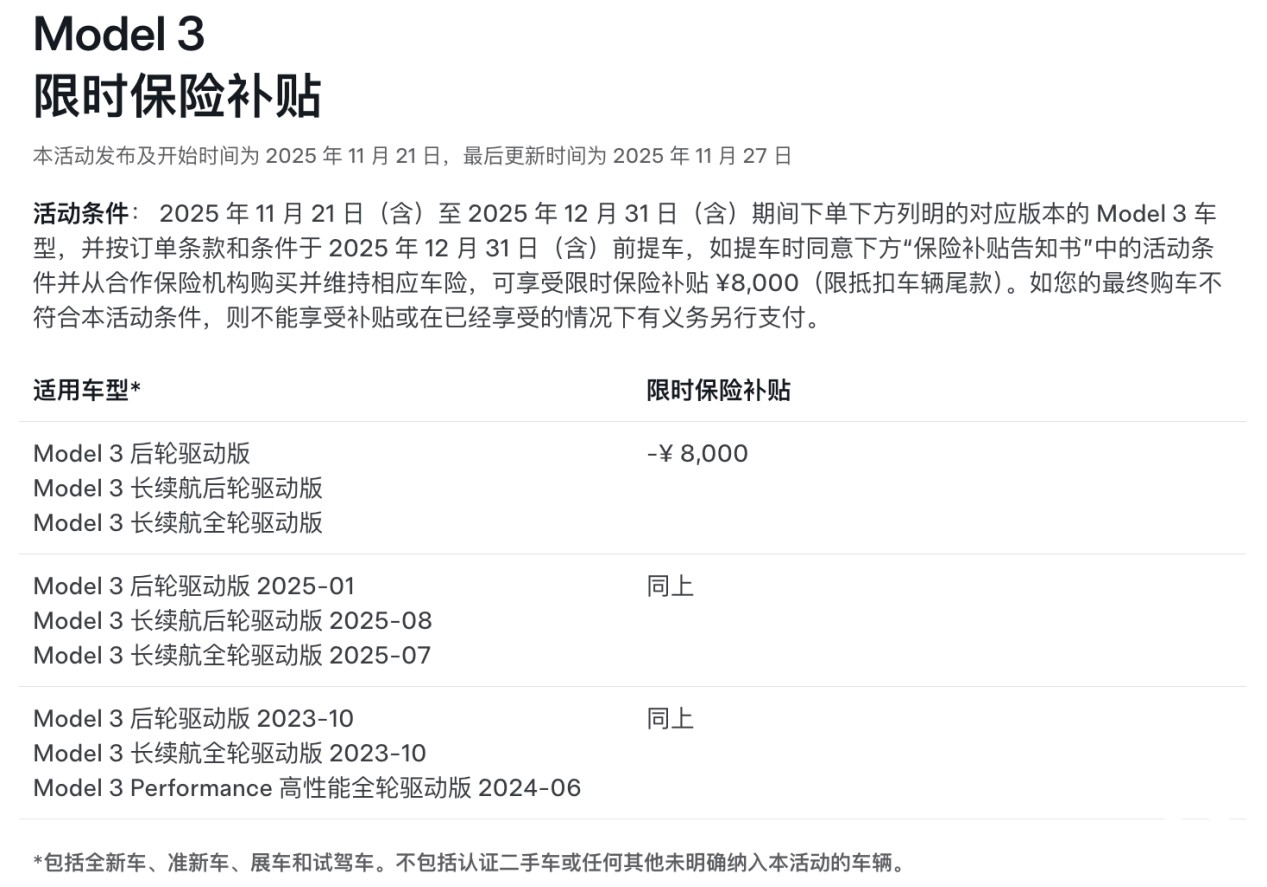 特斯拉打头阵。11月21日,特斯拉官网发布12月购车权益。11月21日至12月31日下单官网列出的Model 3车型可享受限时8000元保险补贴。11月21日起,下单对应版本的Model S和Model X车主,可在提车后获得特享充电权益。