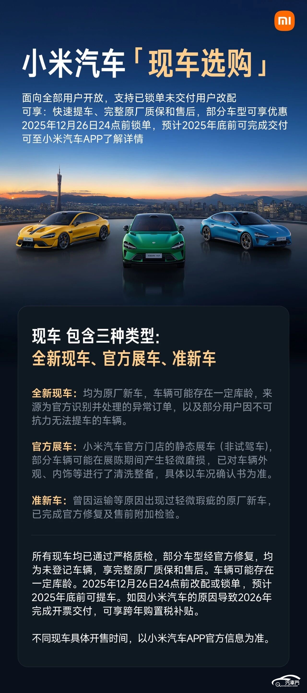 两天后,小米汽车开放“现车选购”。在12月26日24点前锁单,预计今年年底前可完成交付。这也意味着小米汽车车主提车速度更快了。