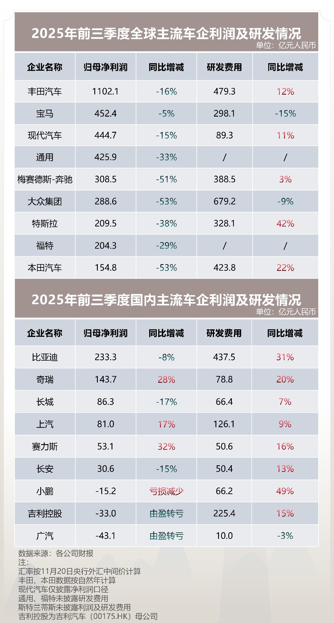 2025 年三季度收官,全球汽车业的 “冰火两重天” 在财报数据中被彻底放大:一边是斯特兰蒂斯、奔驰、本田等海外巨头销量利润双降,大众、宝马研发投入收缩,传统车企的 “大象转身” 陷入阵痛;另一边是比亚迪、奇瑞、小鹏等中国车企销量两位数飙升,研发费用保持高速增长,在全球车市的调整期里硬生生走出了一条稳健增长曲线。这场从销量到利润、从营收到研发的全方位分化,不仅标志着全球汽车业 “东升西降” 的趋势愈发明显,更揭开了中国车企打破传统格局的核心密码。