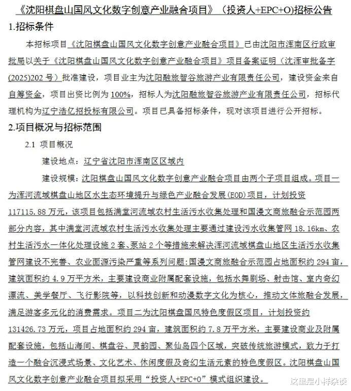 沈阳旅游集团旗下公司直接进行了这个项目的招标。这个项目有两部分组成,项目一为浑河流域棋盘山地区水生态环境提升与绿色产业融合发展(EOD)项目,计划投资117115.88万元,该项目包括满堂河流域农村生活污水收集处理和国漫文商旅融合示范园两部分内容。这个项目将对满堂河流域的农村生活污水进行处理,建立统一管网和一体化处理设施,解决棋盘山地区农村污水问题,减少对农田的污染。另外一个是国漫文商旅融合示范园,占地面积约29亩,建筑面积约4.9万平方米,主要建设商业附属配套设施,包括水舞剧场、射击馆、室内奇幻漂流、美学餐厅、飞行影院等,以科技创新和动漫数字文化为核心,推动文体旅融合发展,满足游客多元化的消费需求。