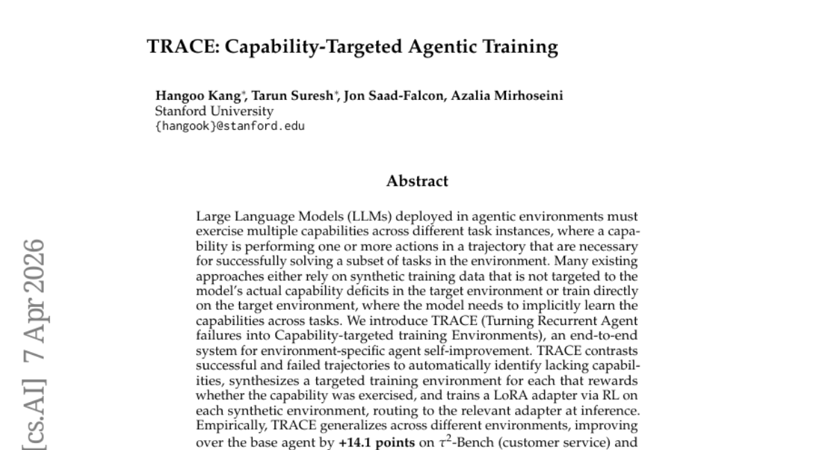 这项由斯坦福大学主导的研究以预印本形式于2026年4月发表,论文编号为arXiv:2604.05336v1,有兴趣深入了解的读者可以通过该编号在arXiv平台查询完整论文。研究提出了一个名为TRACE的系统,全称是"Turning Recurrent Agent failures into Capability-targeted training Environments",中文可以理解为"把反复出现的失败转化为针对性训练环境"。