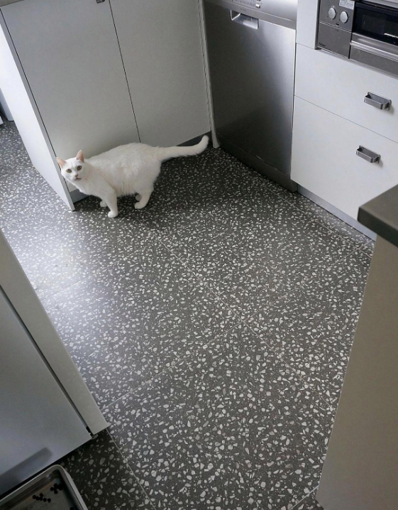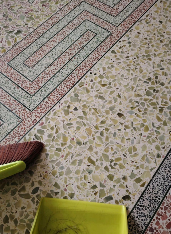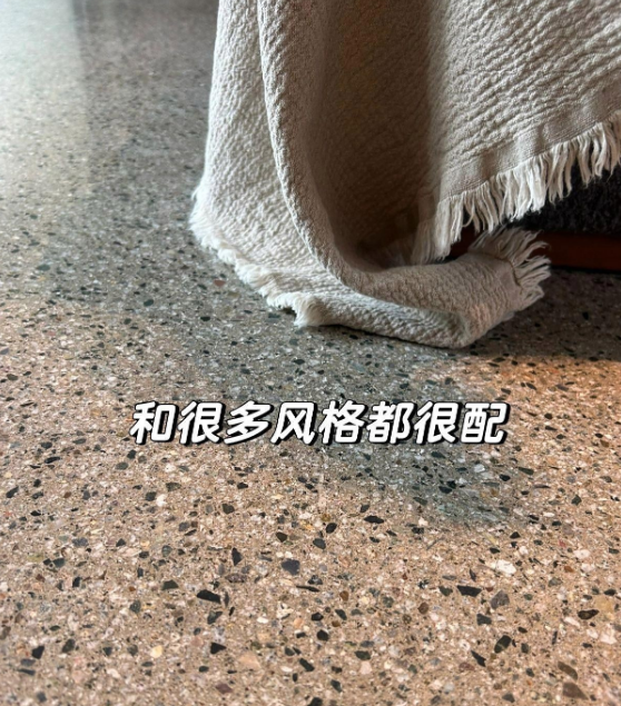 水磨石表面有密集的颗粒,再加上颜色的遮盖力,平时有点脏东西掉在地上,不仔细看根本发现不了。