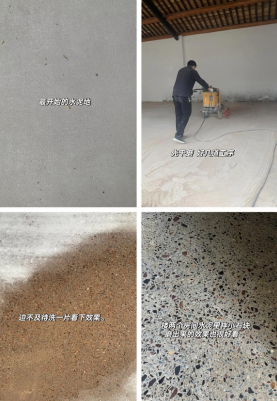 有人分享过自己做水磨石的经历:浇水泥地面的时候,在水泥里掺了些小石头,等水泥固化后,再把地面打磨平整,就做出了水磨石的效果。